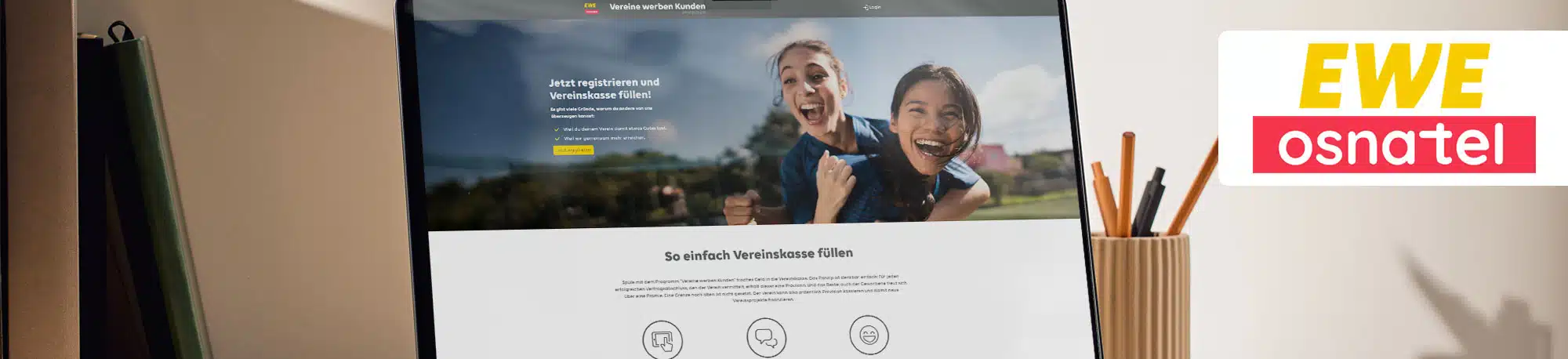 Vereine können sich bei EWE Vereine werben Kunden registrieren. Sobald die Prüfung und Freischaltung erfolgt ist, können Sie über das Programm ausgewählte Produkte von EWE und osnatel empfehlen. Erfolgt eine erfolgreiche Empfehlung, d. h. es kommt ein Vertrag zustande, erhält der Verein eine Provision und der Neukunde erhält ebenfalls eine Prämie. Die erhaltenen Provisionen kommen direkt dem jeweiligen Verein zugute und können für verschiedene Projekte, Anschaffungen und die Vereinsarbeit genutzt werden.